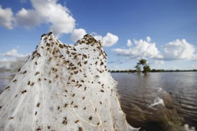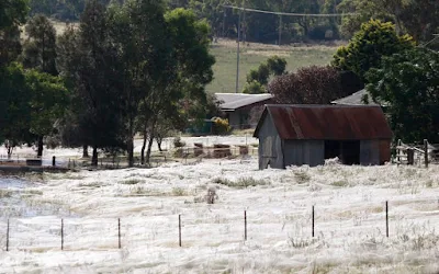 Οι σοβαρές πλημμύρες προκάλεσαν την εισβολή των αραχνών, σαν χιόνι ή άσπρο χνούδι από λεύκες, σε όλες οι παράκτιες περιοχές.....