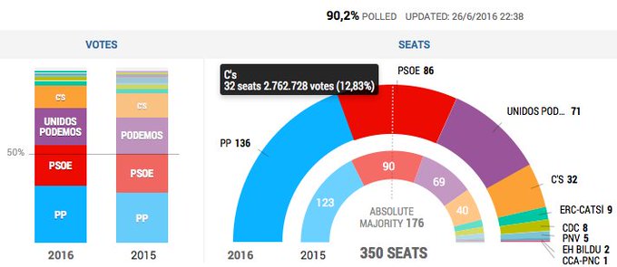 Όπως όλα δείχνουν, οι Podemos διατήρησαν τις δυνάμεις τους (παρά τη συνεργασία που έκαναν οι Podemos με την Ενωμένης Αριστεράς-IU, που ήλπιζαν σε αύξηση των ποσοστών τους). Οι Σοσιαλιστές χάνουν κάποιες έδρες και ενισχύθηκε ο Ραχόι, παίρνοντας από τους Ciudadanos.