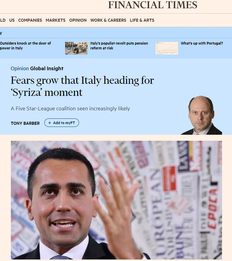 Οι οικονομικές συνθήκες στην Ιταλία σήμερα είναι πιο ευνοϊκές από εκείνες στην Ελλάδα το 2015, σύμφωνα με τους Financial Times. Η οικονομία αναπτύσσεται. Η χώρα πραγματοποιεί πρωτογενή πλεονάσματα κάθε χρόνο. Το προφίλ χρέους της Ιταλίας είναι σταθερό: οι μέσες διάρκειες είναι περίπου επτά έτη. Ωστόσο, οι κίνδυνοι είναι απλοί. Το παλιό, φιλοευρωπαϊκό σύστημα της Ιταλίας "σπάει". Εάν βρίσκονται στην εξουσία, ένας συνασπισμός με το Κίνημα των Πέντε Αστεριών, ενδέχεται να αντιστρέψουν τις πρόσφατες οικονομικές μεταρρυθμίσεις και να αυξήσουν τα δημοσιονομικά ελλείμματα ακριβώς όπως η ΕΚΤ λύει τα υποστηρικτικά της μέτρα. Σε εκείνο το σημείο, ίσως στα τέλη του 2019 ή το πρώτο εξάμηνο του 2020, η ευρωζώνη μπορεί να εκτιμήσει την αλήθεια της παλιάς παροιμιάς ότι οι χρηματοπιστωτικές αγορές είναι ήρεμες... μέχρι να μην είναι.