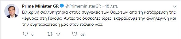 "Ειλικρινή συλλυπητήρια στους συγγενείς των θυμάτων από την κατάρρευση της γέφυρας στη Γένοβα. Αυτές τις δύσκολες ώρες, εκφράζουμε την αλληλεγγύη και την συμπαράστασή μας στον ιταλικό λαό", έγραψε ο πρωθυπουργός.