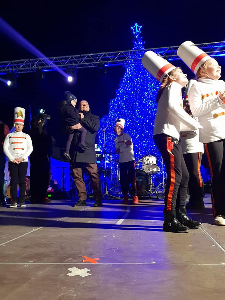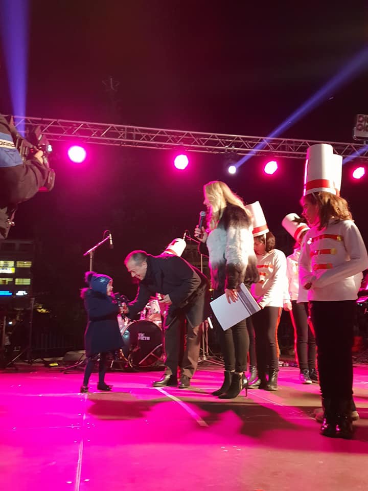 Ο δήμαρχος Νίκος Σταυρογιάννης, με τη βοήθεια ενός μικρού παιδιού άναψε τα φώτα του Χριστουγεννιάτικου δέντρου.