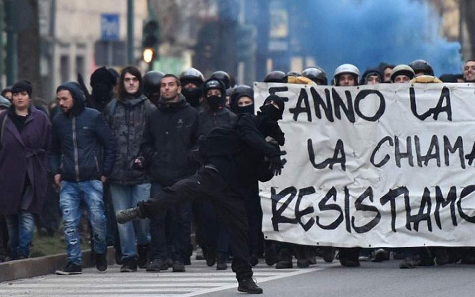 Επεισόδια ανάμεσα σε μέλη της εξωκοινοβουλευτικής αριστεράς και αναρχικούς που διαμαρτύρονταν για την εκκένωση μιας κατάληψης και τις δυνάμεις επιβολής της τάξης ξέσπασαν το βράδυ του Σαββάτου στο κέντρο του Τορίνου (βορειοδυτική Ιταλία), με αποτέλεσμα τέσσερις άνθρωποι να τραυματιστούν και οι αρχές να ανακοινώσουν τουλάχιστον δώδεκα προσαγωγές.