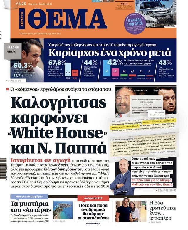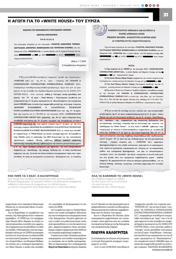 Ωστόσο, η πλευρά Καλογρίτσα αρνείται το χρέος και υποστηρίζει ότι τα χρήματα τα πήρε η εταιρεία «Τοξότης» «υπό τον συντονισμό, την εποπτεία και καθοδήγηση του... White House». Οταν ρωτήθηκαν οι δικηγόροι Καλογρίτσα ποιο είναι το περίφημο «White House» η απάντησή τους ήταν αποκαλυπτική: «Oταν λέμε "White House" εννοούμε το Μέγαρο Μαξίμου και τον Νίκο Παππά»!