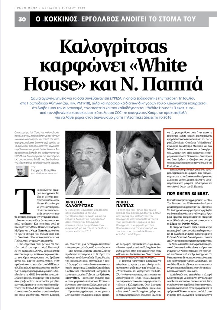 Οπως αποκαλύπτει το Πρώτο Θέμα της Κυριακής, ο Χρήστος Καλογρίτσας υποστηρίζει ότι η σύμβαση που έκανε ύψους 3 εκατ. ευρώ με την εταιρεία λιβανέζικων συμφερόντων CCC ήταν εικονική και ότι τα χρήματα δόθηκαν ως προκαταβολή στην εταιρεία του Καλογρίτσα προκειμένου να συμμετάσχει στον διαγωνισμό για τις τηλεοπτικές άδειες το καλοκαίρι του 2016!