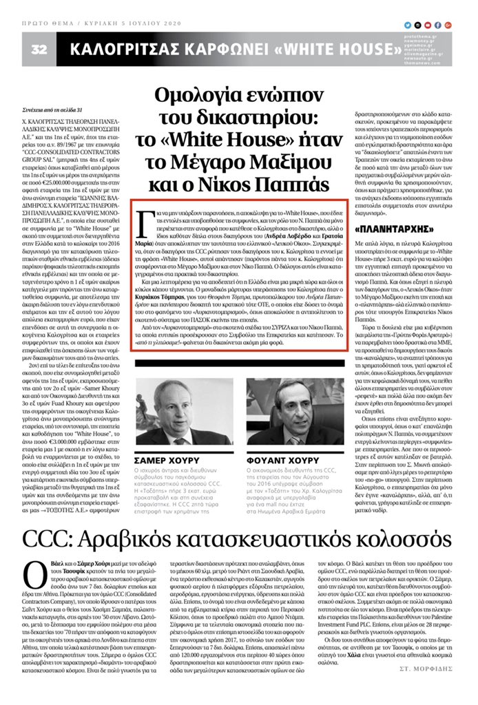 Η αποκάλυψη έγινε την περασμένη Τετάρτη στο Μονομελές Πρωτοδικείο της Ευελπίδων, όπου συζητήθηκε η αστική διαφορά της πολυεθνικής κατασκευαστικής εταιρείας Al Ghandi & Consolidated Contractors International Company llc (CCC) κατά της εταιρείας «Τοξότης» του Χρήστου Καλογρίτσα. Η αλλοδαπή εταιρεία είναι ο επιχειρηματικός κολοσσός CCC της λιβανέζικης οικογένειας Χούρυ, με έδρα το Μαρούσι.