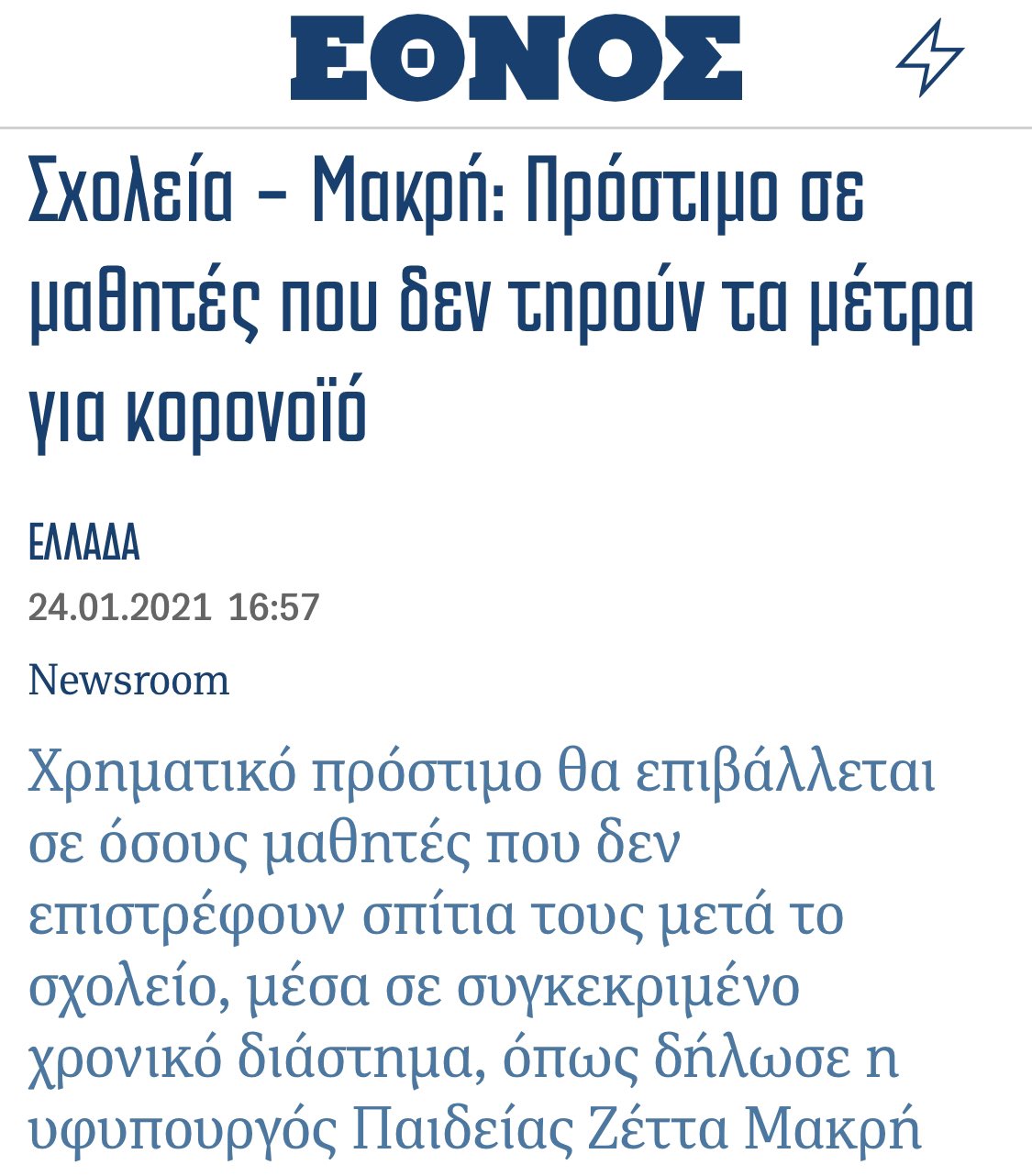 Πρόστιμα στους μαθητές και τις μαθήτριες που θα κάθονται σε πλατείες με την παρέα τους αφού τελειώσει το μάθημα στο σχολείο και δεν θα επιστρέφουν σπίτι τους προανήγγειλε η υφυπουργός Παιδείας, Ζέττα Μακρή, αναφορικά με το άνοιγμα των σχολείων την 1η Φεβρουαρίου...