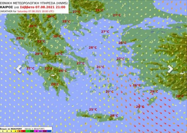 Άνεμοι: Βόρειοι βορειοανατολικοί 3 με 4 και στα ανατολικά 5 μποφόρ.