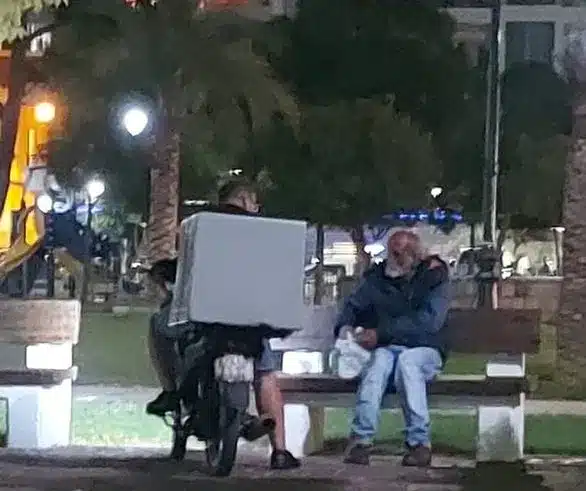 Προέρχεται από το βράδυ της Τετάρτης στην πλατεία Υψηλών Αλωνίων. Ο ηλικιωμένος άνδρας καθόταν στο παγκάκι και έλεγε διάφορα, φωνάζοντας μόνος του. Είναι προφανώς ένας από άστεγους της Πάτρας που ζουν εγκαταλειμμένοι στις πλατείες και στα παγκάκια της πόλης, χωρίς να έχουν έναν δικό τους άνθρωπο.Ένα παιδί (δεν γνωρίζουμε ποιο και ούτε και έχει και τόση μεγάλη σημασία), ένα εργαζόμενο παιδί που παλεύει για το μεροκάματο και εργάζεται με τις ώρες πάνω σε ένα μηχανάκι ως ντιλιβεράς, τον πλησιάζει με το δίκυκλο και κατευθύνεται στο παγκάκι.