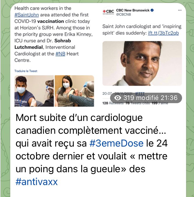 Ένας 52χρονος διακεκριμένος καρδιολόγος στο New Brunswick στον Καναδά πέθανε ξαφνικά στον ύπνο του μόλις δύο εβδομάδες αφότου έκανε τη 3η δόση εμβολίου του Covid αναφέρει το thecovidblog.com στις 9/11/21.Κατά τη διάρκεια του καλοκαιριού ο Δρ. Sohrab Lutchmedial επιτέθηκε σε μη εμβολιασμένους «εγωιστές» όπως έλεγε ανθρώπους που επέλεξαν να μην κάνουν το εμβόλιο Covid.
