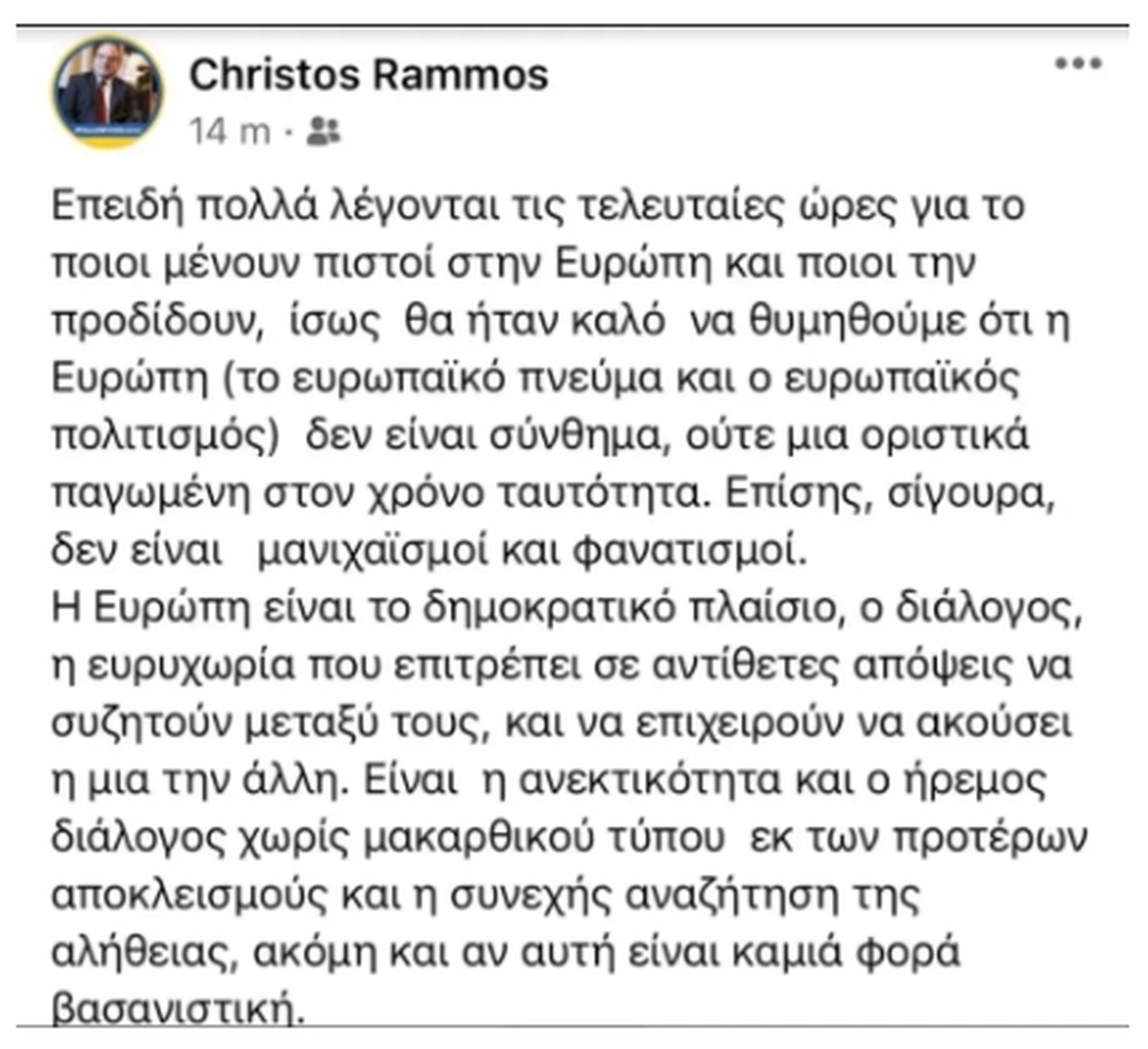 "Επειδή πολλά λέγονται τις τελευταίες ώρες για το ποιοι μένουν πιστοί στην Ευρώπη και ποιοι την προδίδουν, ίσως θα ήταν καλό να θυμηθούμε ότι η Ευρώπη (το ευρωπαϊκό πνεύμα και ο ευρωπαϊκός πολιτισμός) δεν είναι σύνθημα, ούτε μία οριστικά παγωμένη στον χρόνο ταυτότητα. Επίσης, σίγουρα, δεν είναι μανιχαϊσμοί και φανατισμοί" σημείωσε αρχικά στην ανάρτησή του ο κ. Ράμμος.