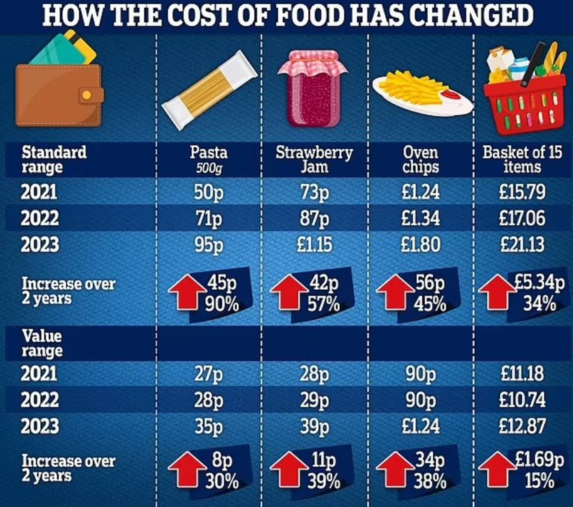 Το συνολικό κόστος του καλαθιού έχει αυξηθεί από 15,79 λίρες το 2021 σε 21,13 λίρες το 2023.