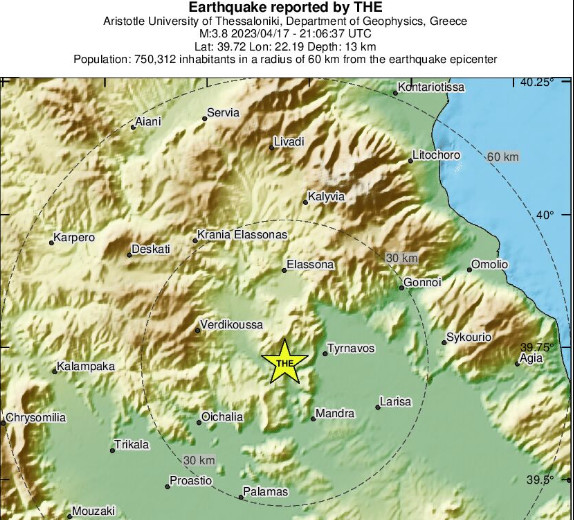 Σεισμός 3,6 Ρίχτερ με επίκεντρο κοντά στον Τύρναβο έγινε αισθητός και στη Λάρισα. Ασθενής σεισμική δόνηση 3,6 βαθμών της κλίμακας Ρίχτερ σημ...