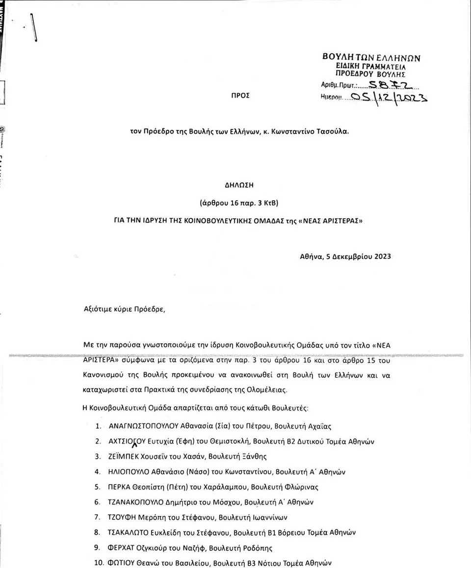 Δήλωση για την ίδρυση του κόμματος της «Νέας Αριστεράς» απέστειλε προς τον πρόεδρο της Βουλής Κ. Τασούλα, ο πρόεδρος της νέας κοινοβουλευτικ...