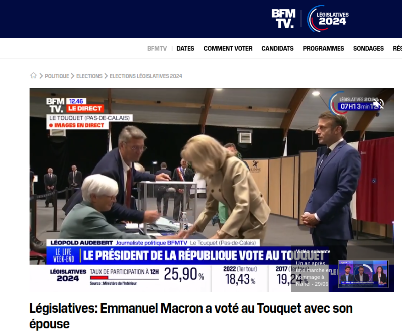 Έτσι, ο πρόεδρος και η σύζυγός του επέλεξαν ένα εκλογικό κέντρο στην πόλη Le Touquet, όπου βρίσκεται η κατοικία τους, για να συμμετάσχουν στην ψηφοφορία. Το βίντεο παρακολούθησης που δημοσίευσε το BFMTV δείχνει ότι, αφού στάθηκε στην ουρά, ο Εμμανουήλ τοποθέτησε το ψηφοδέλτιο στην κάλπη και στη συνέχεια υπέγραψε το όνομά του στον εκλογικό κατάλογο. Η σύζυγός του, σε αντίθεση με το πρωτόκολλο, με ένα ψηφοδέλτιο στα χέρια πήγε αμέσως να υπογράψει, παρακάμπτοντας την ψηφοθηρία.
