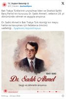 «Ο αξέχαστος ηγέτης των Τούρκων της Δυτικής Θράκης και ιδρυτής του Κόμματος Ισότητας και Ειρήνης Δρ. Σαντίκ Αχμέτ. Εορτάζουμε τη μνήμη του Σαντίκ Αχμέτ με έλεος και σεβασμό στην 29η επέτειο του θανάτου του. Θα συνεχίσουμε να υποστηρίζουμε αποφασιστικά τον αγώνα στον οποίο ο Σαντίκ Αχμέτ αφιέρωσε τη ζωή του για να κερδίσει η ‘’Τουρκική Μειονότητα της Δυτικής Θράκης’’ τα νόμιμα δικαιώματά της».