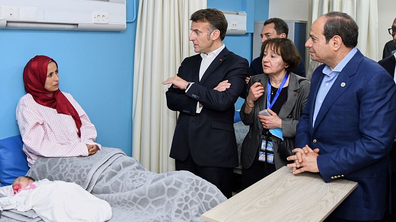 Macron visits a Palestinian patient at a ward for Palestinian patients at El Arish Hospital, Egypt. Egyptian Presidency Media Office via AP