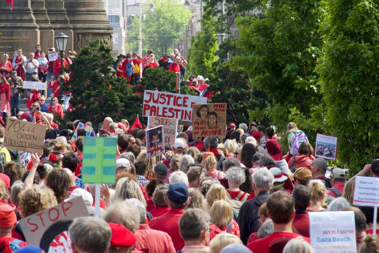 Δεκάδες χιλιάδες πολίτες, φορώντας συμβολικά κόκκινα ρούχα, διαδήλωσαν την Κυριακή στη Χάγη για να απαιτήσουν από την κυβέρνηση να αναλάβει δράση ώστε να σταματήσει η στρατιωτική επιχείρηση του Ισραήλ στη Γάζα.