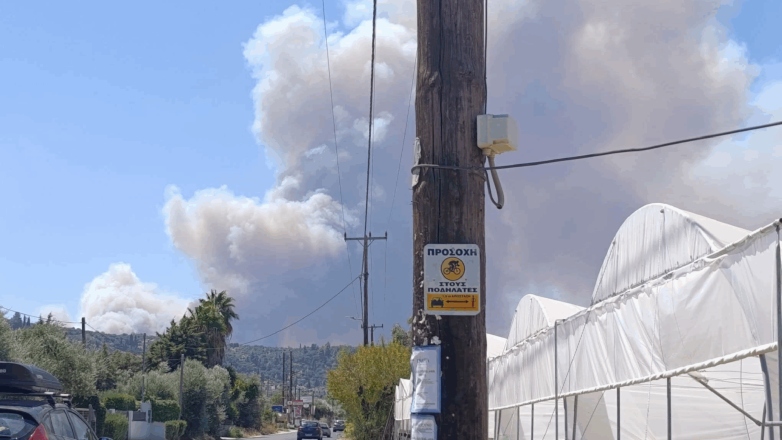 Στην περιοχή, σύμφωνα με την Πυροσβεστική, πνέουν ισχυροί άνεμοι.