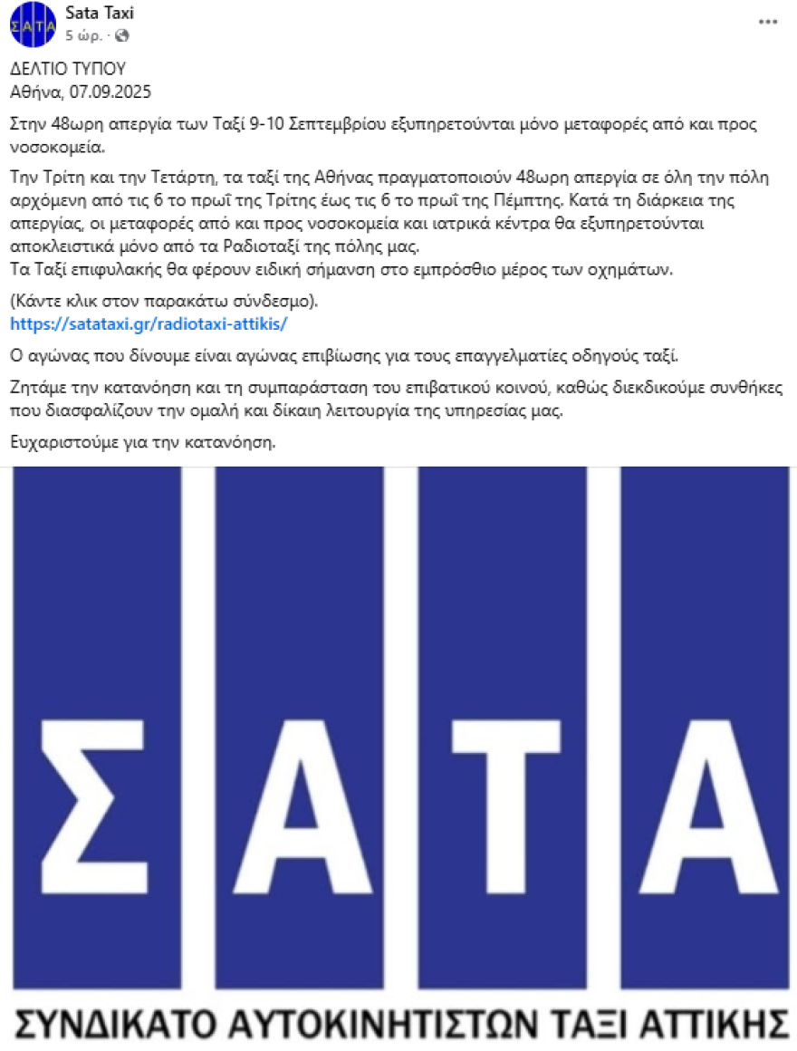 «Ο αγώνας που δίνουμε είναι αγώνας επιβίωσης για τους επαγγελματίες οδηγούς ταξί. Ζητάμε την κατανόηση και τη συμπαράσταση του επιβατικού κοινού, καθώς διεκδικούμε συνθήκες που διασφαλίζουν την ομαλή και δίκαιη λειτουργία της υπηρεσίας μας. Ευχαριστούμε για την κατανόηση», αναφέρει το ΣΑΤΑ.
