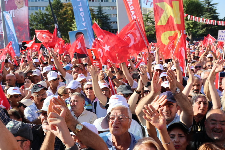 Στην ομιλία του από την εξέδρα της συγκέντρωσης, ο ηγέτης του CHP Οζγκιούρ Εζέλ δήλωσε ότι το πλήθος βρίσκεται εκεί «για να αντιταχθεί στο δικαστικό πραξικόπημα κατά του κόμματος».