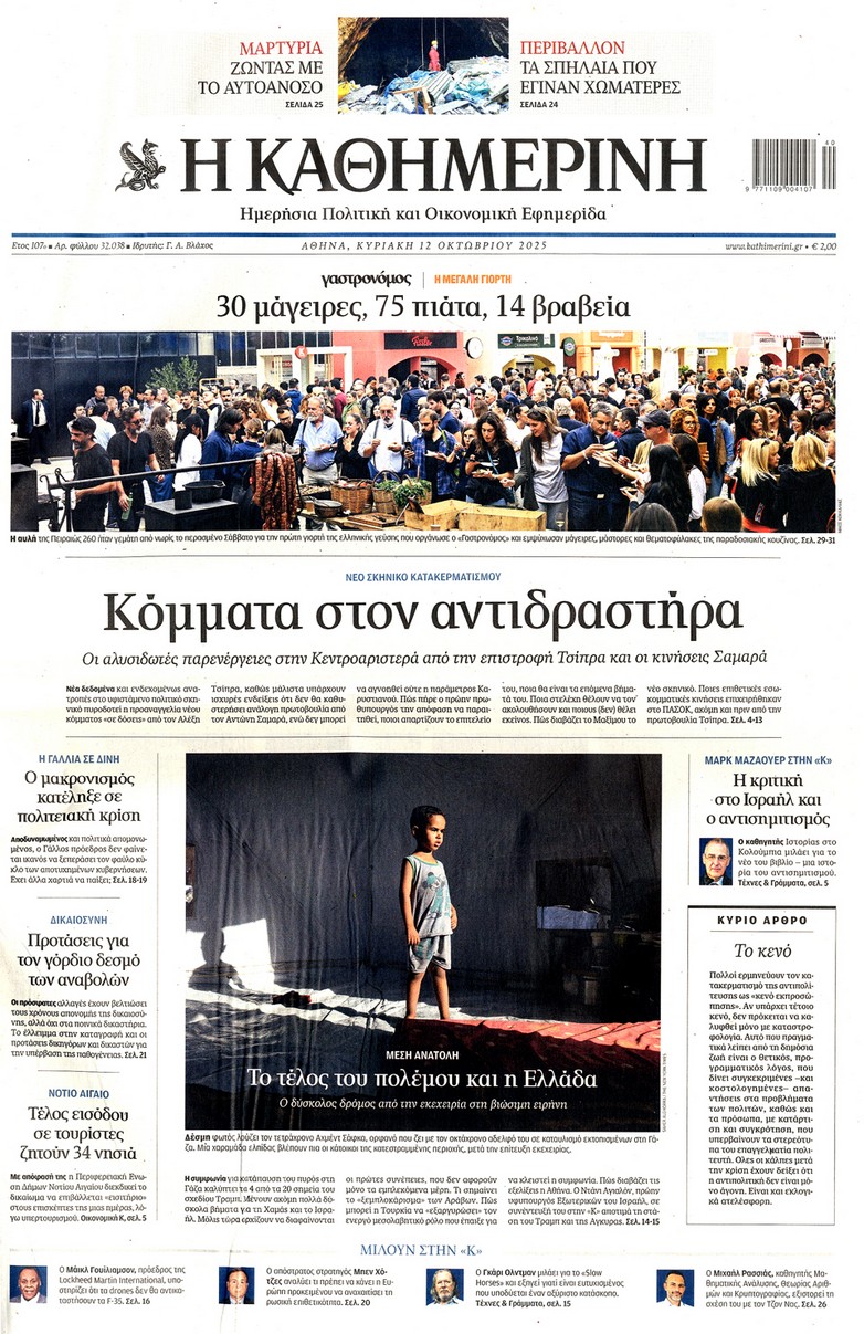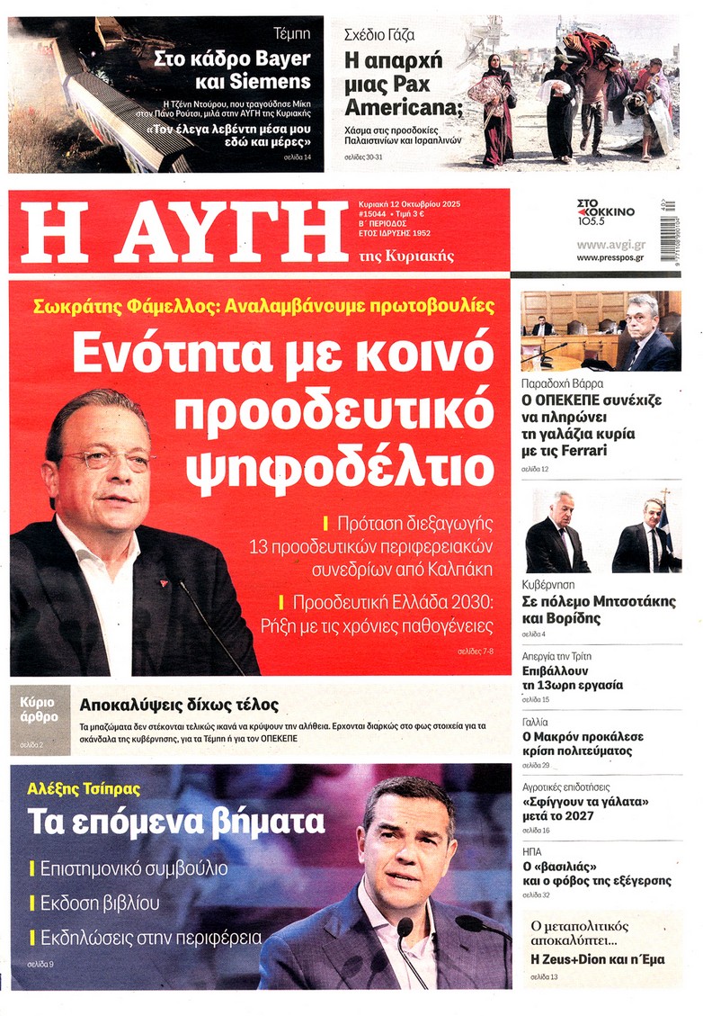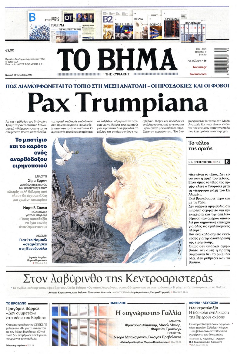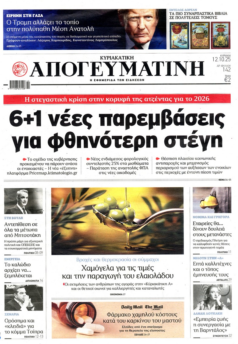 Οι κινήσεις Τραμπ για τη συμφωνία κατάπαυσης του πυρός στη Γάζα, τα επόμενα βήματα του Αλέξη Τσίπρα και οι πρωτοβουλίες της κυβέρνησης για την καταπολέμηση της ακρίβειας ξεχωρίζουν στα πρωτοσέλιδα των κυριακάτικων εφημερίδων.