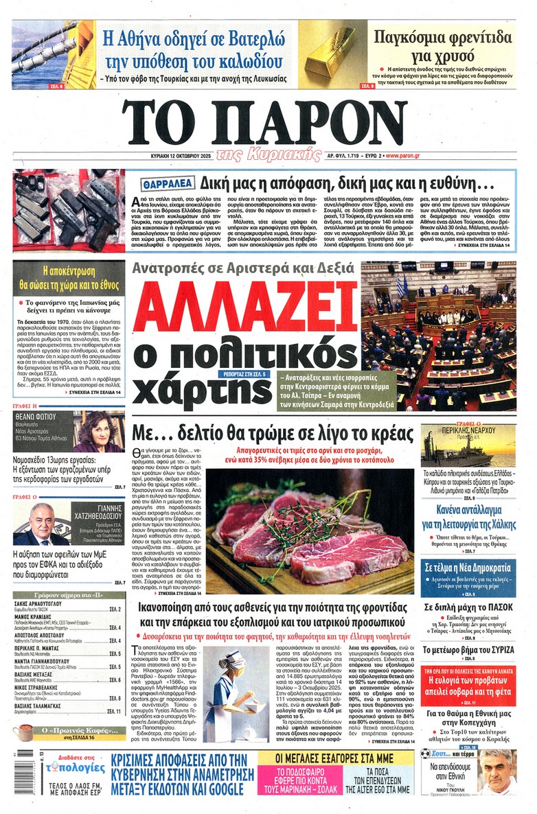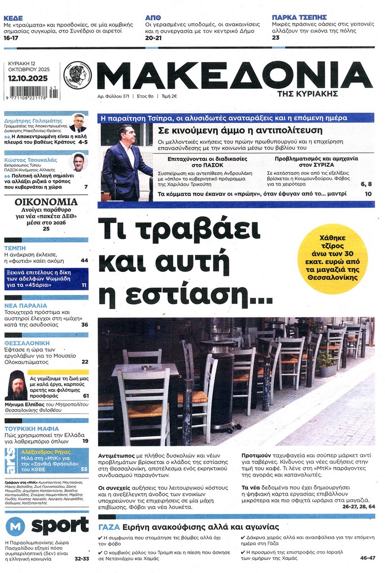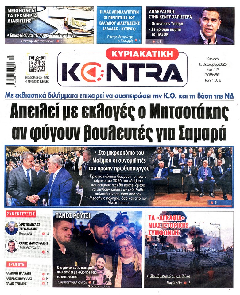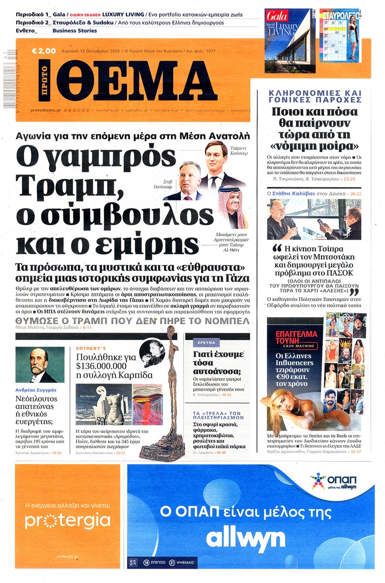 Οι κινήσεις Τραμπ για τη συμφωνία κατάπαυσης του πυρός στη Γάζα, τα επόμενα βήματα του Αλέξη Τσίπρα και οι πρωτοβουλίες της κυβέρνησης για την καταπολέμηση της ακρίβειας ξεχωρίζουν στα πρωτοσέλιδα των κυριακάτικων εφημερίδων.