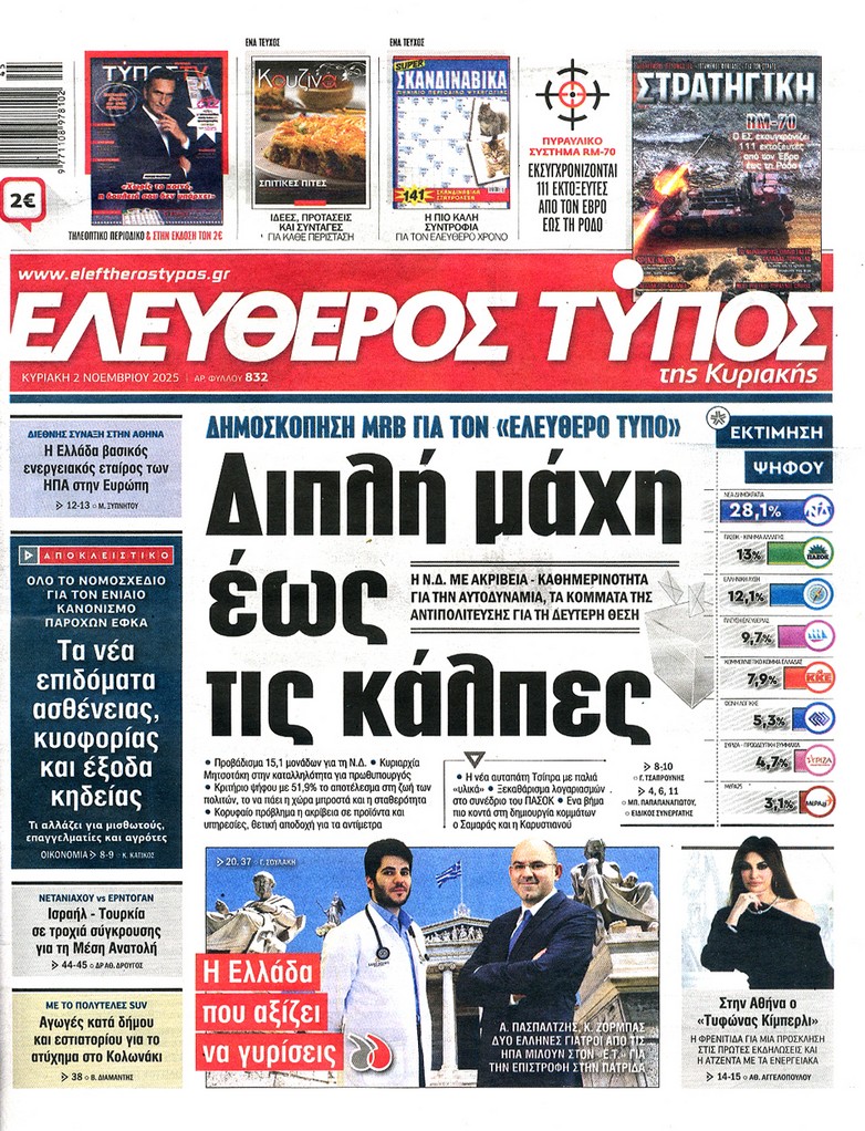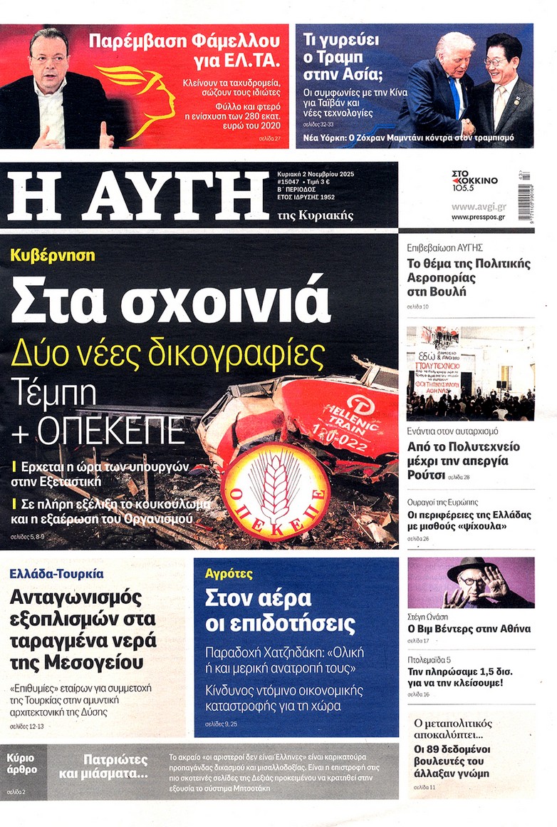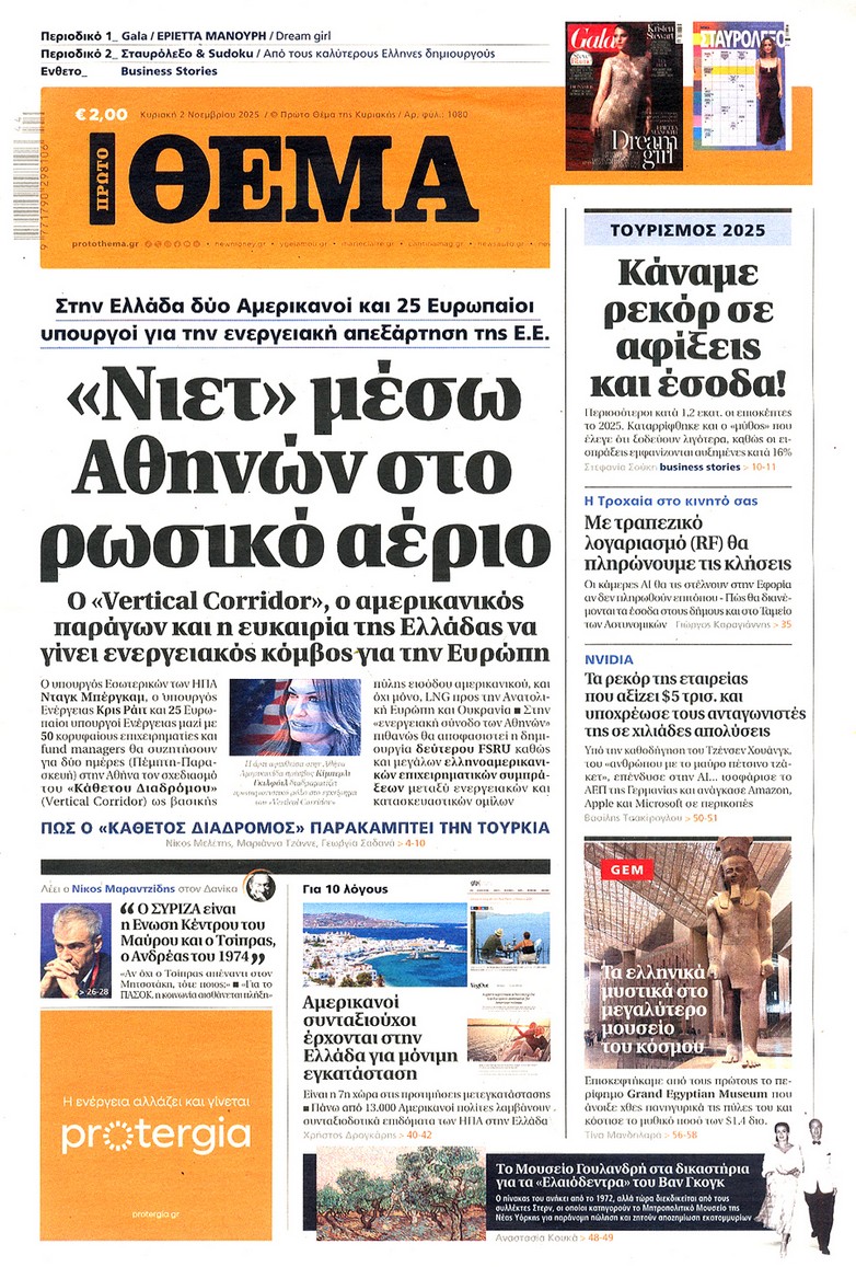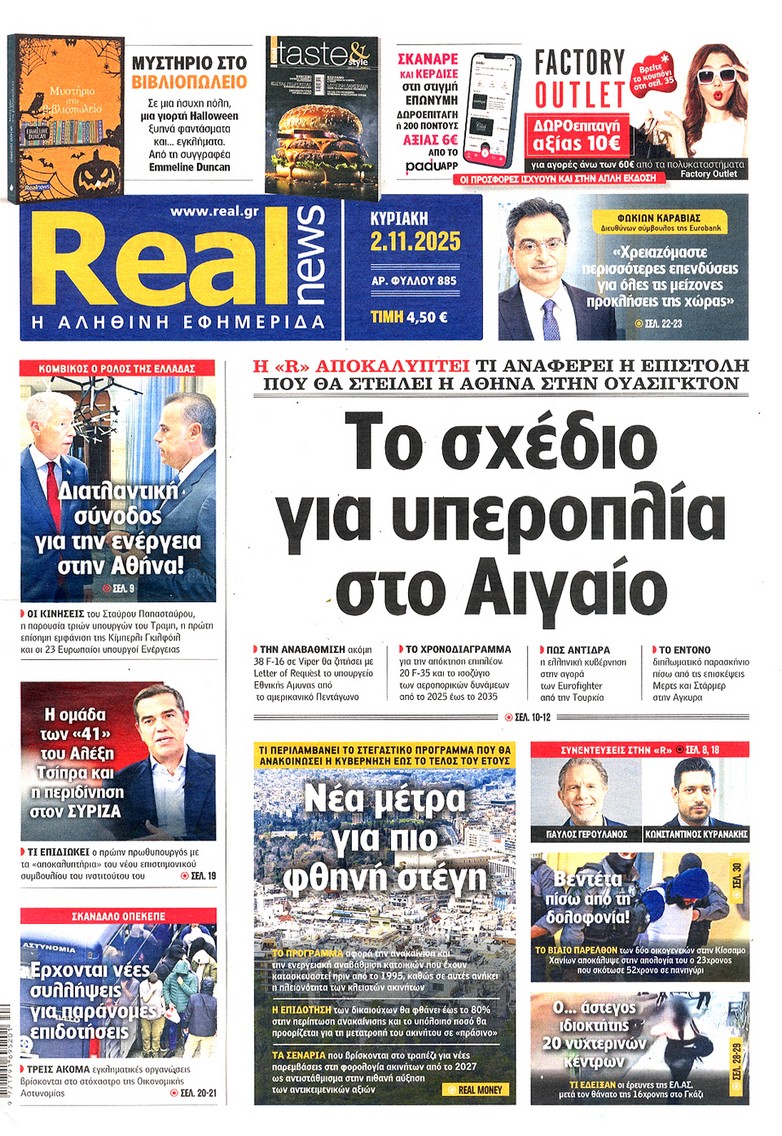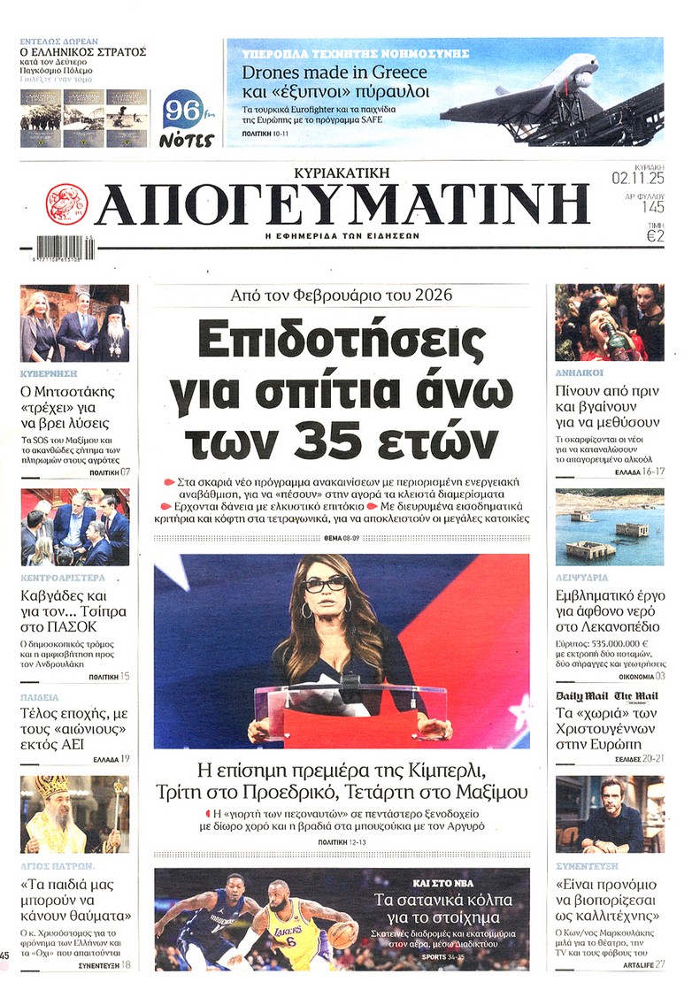 Η ευκαιρία της Ελλάδας να γίνει ενεργειακός κόμβος για την Ευρώπη με την έλευση των 2 Αμερικανών υπουργών και 25 Ευρωπαίων στη Αθήνα την ερχόμενη Πέμπτη, η προσπάθεια της Τουρκίας να ενταχθεί στη νέα ευρωπαϊκή αρχιτεκτονική ασφαλείας με τα Eurofighter και τα αντίβαρα που διαθέτει και σχεδιάζει να αναπτύξει η Ελληνική Πολεμική Αεροπορία και το νέο στεγαστικό πρόγραμμα που θα ανακοινώσει η κυβέρνηση μέχρι το τέλος του έτους αλλά και νέα σκάνδαλα ξεχωρίζουν στα πρωτοσέλιδα των κυριακάτικων εφημερίδων.