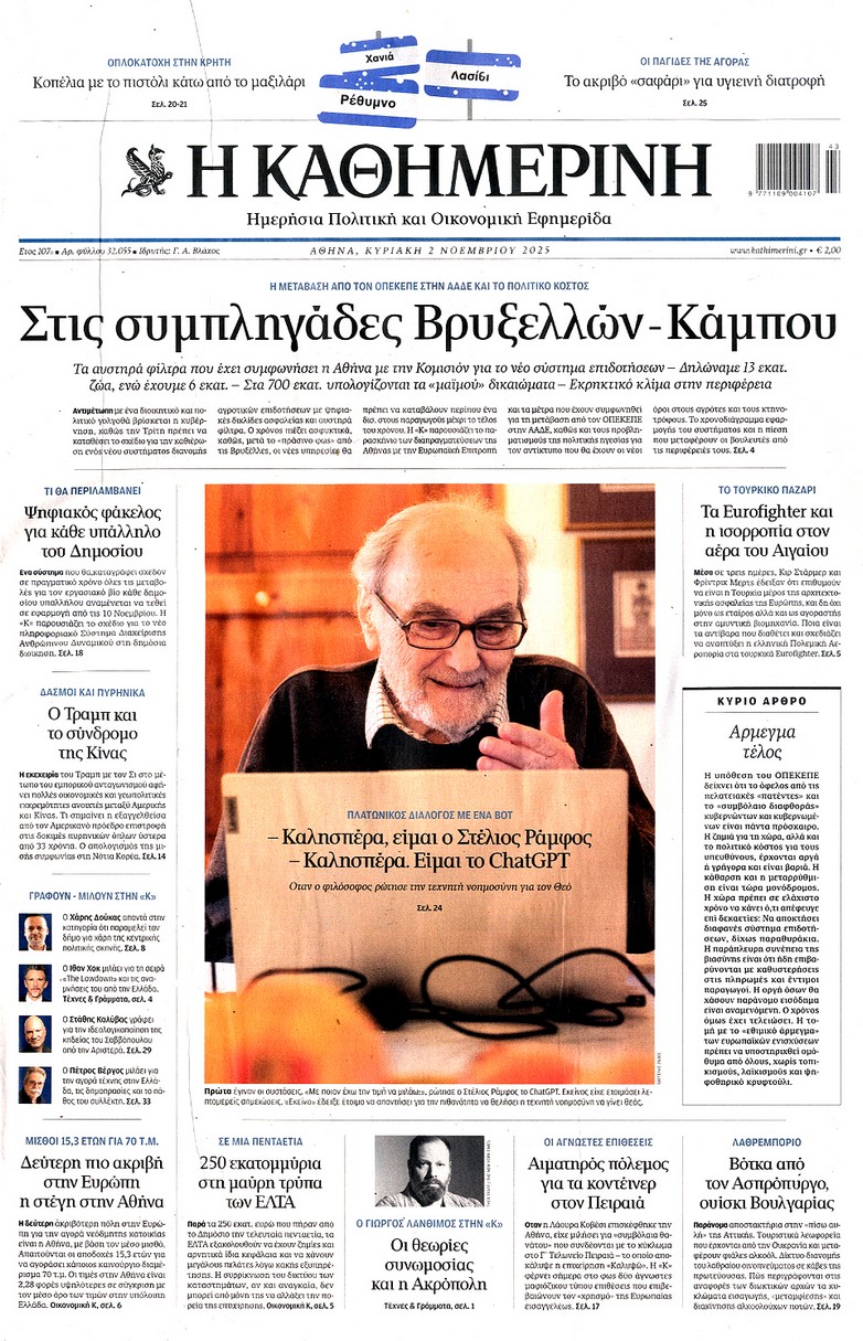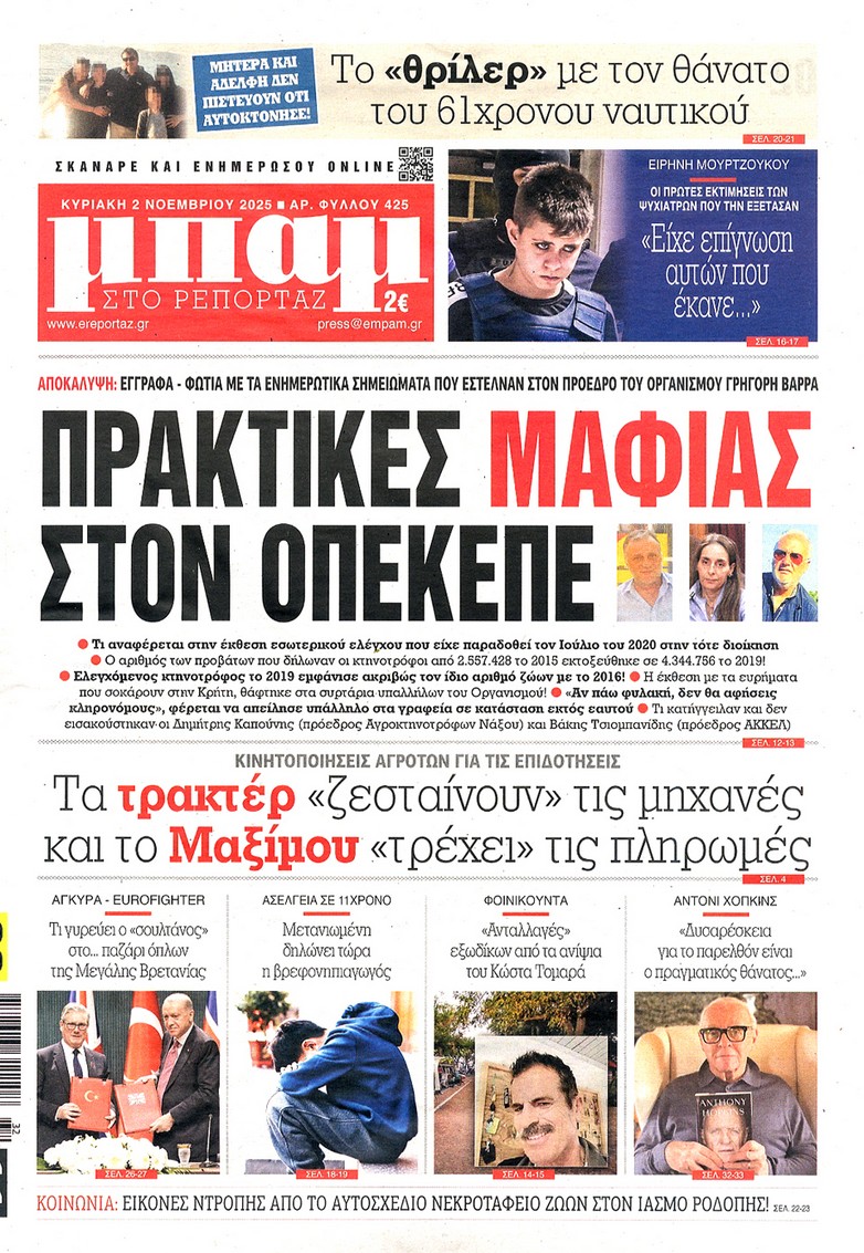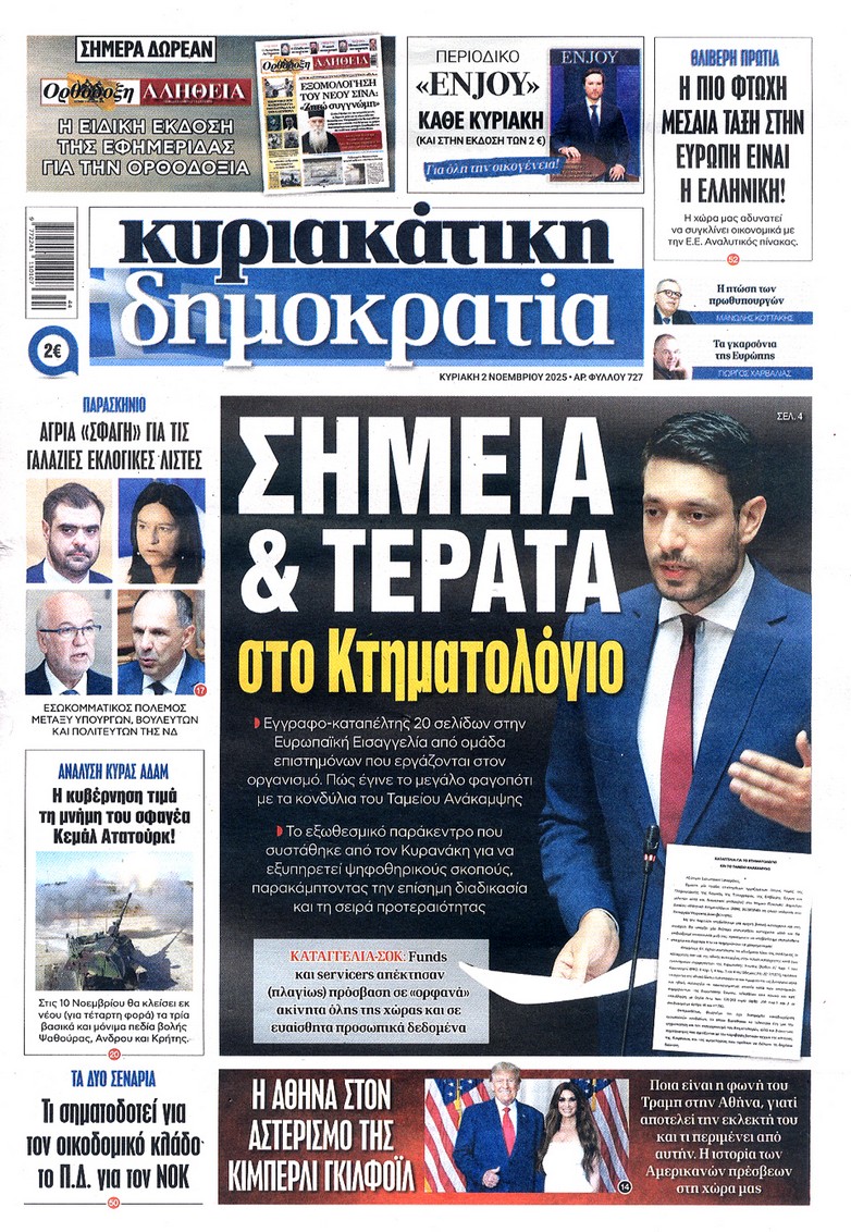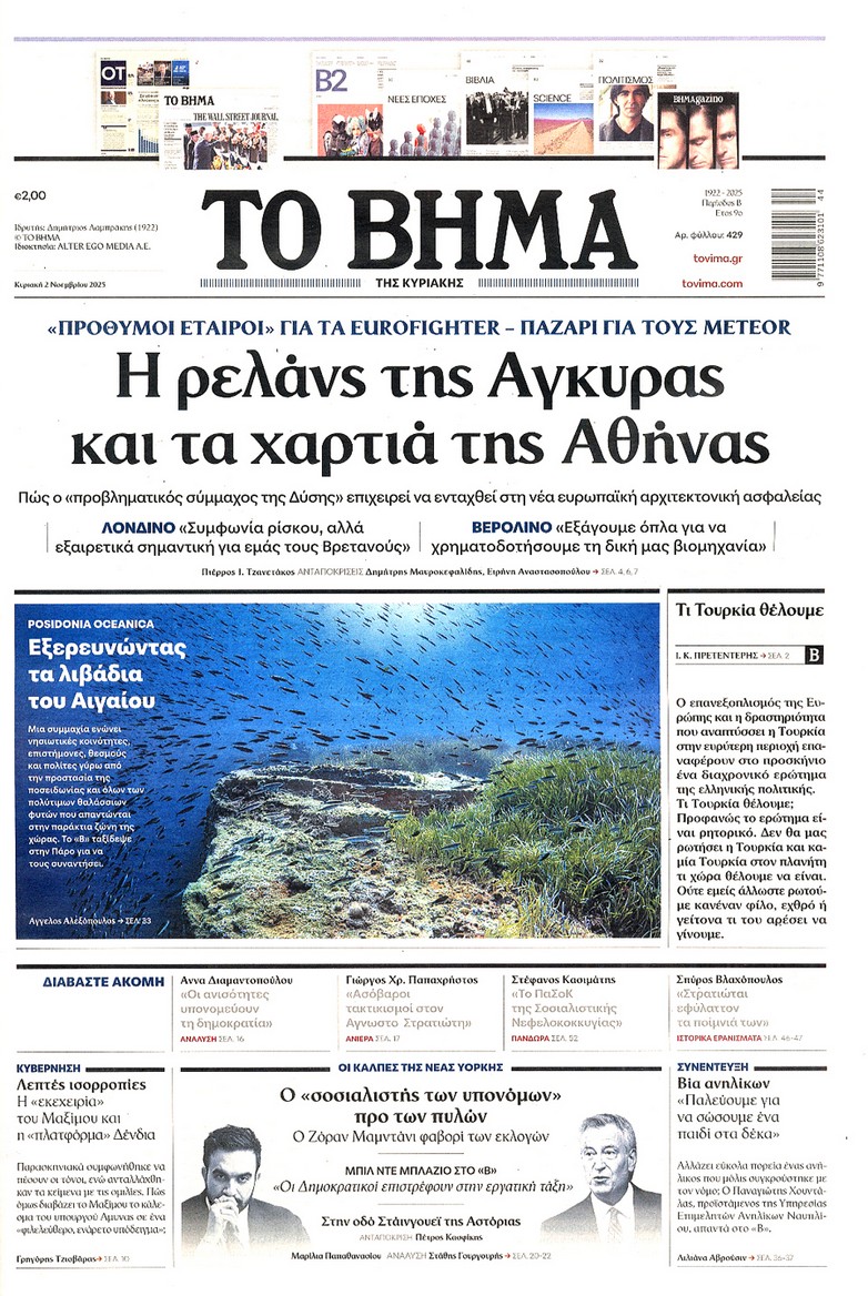 Η ευκαιρία της Ελλάδας να γίνει ενεργειακός κόμβος για την Ευρώπη με την έλευση των 2 Αμερικανών υπουργών και 25 Ευρωπαίων στη Αθήνα την ερχόμενη Πέμπτη, η προσπάθεια της Τουρκίας να ενταχθεί στη νέα ευρωπαϊκή αρχιτεκτονική ασφαλείας με τα Eurofighter και τα αντίβαρα που διαθέτει και σχεδιάζει να αναπτύξει η Ελληνική Πολεμική Αεροπορία και το νέο στεγαστικό πρόγραμμα που θα ανακοινώσει η κυβέρνηση μέχρι το τέλος του έτους αλλά και νέα σκάνδαλα ξεχωρίζουν στα πρωτοσέλιδα των κυριακάτικων εφημερίδων.