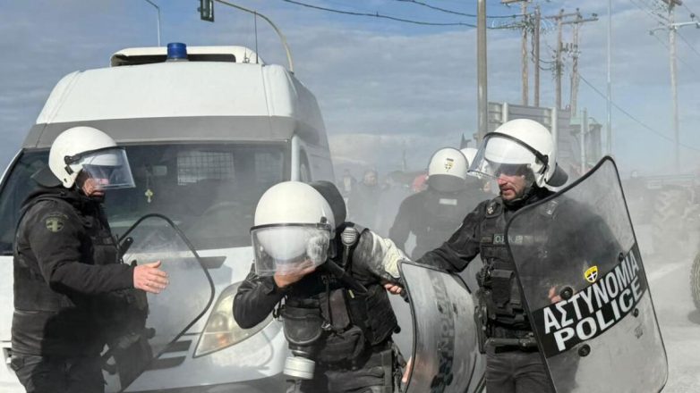 Αγρότης πεσμένος στο έδαφος με τους άνδρες των ΜΑΤ να παρακολουθούν τι συμβαίνει πριν προχωρήσουν σε σύλληψη