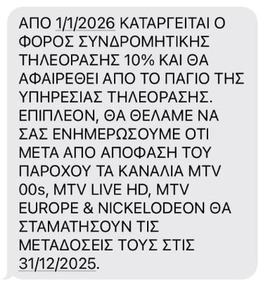 Οι εταιρείες, ενημέρωσαν με sms ότι η μετάδοση των δορυφορικών καναλιών MTV Live HD, MTV Europe και Nickelodeon θα σταματήσει στις 31 Δεκεμβρίου.