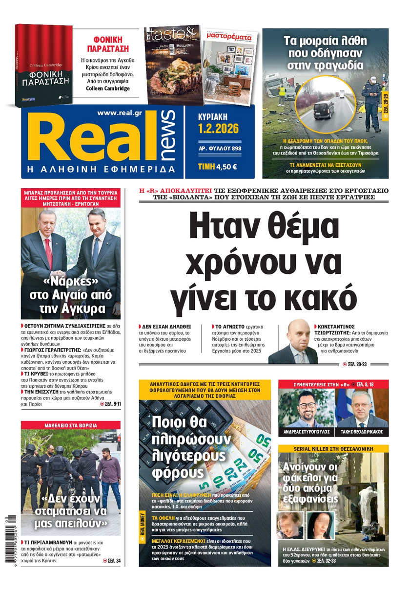 Τα Ελληνοτουρκικά με τα αγκάθια πριν από το ραντεβού Μητσοτάκη-Ερντογάν, οι αλλαγές που ετοιμάζεται να προτείνει ο πρωθυπουργός για το Σύνταγμα, τα όσα έγιναν στο εργοστάσιο της Βιολάντα που έφεραν την τραγωδία, αλλά και η «βαβέλ» των συνεργασιών στο δρόμο για τις κάλπες, ξεχωρίζουν στα πρωτοσέλιδα των κυριακάτικων εφημερίδων.