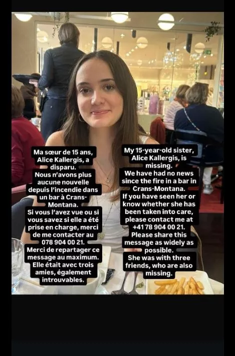 Τα ίχνη μιας 15χρονης, ελληνικής καταγωγής, που βρίσκονταν στο μπαρ «Le Constellation», στο Κραν Μοντανά, όταν ξέσπασε η φονική πυρκαγιά, αναζητούν οι συγγενείς της κάνοντας έκκληση για πληροφορίες μέσα από τα social media.