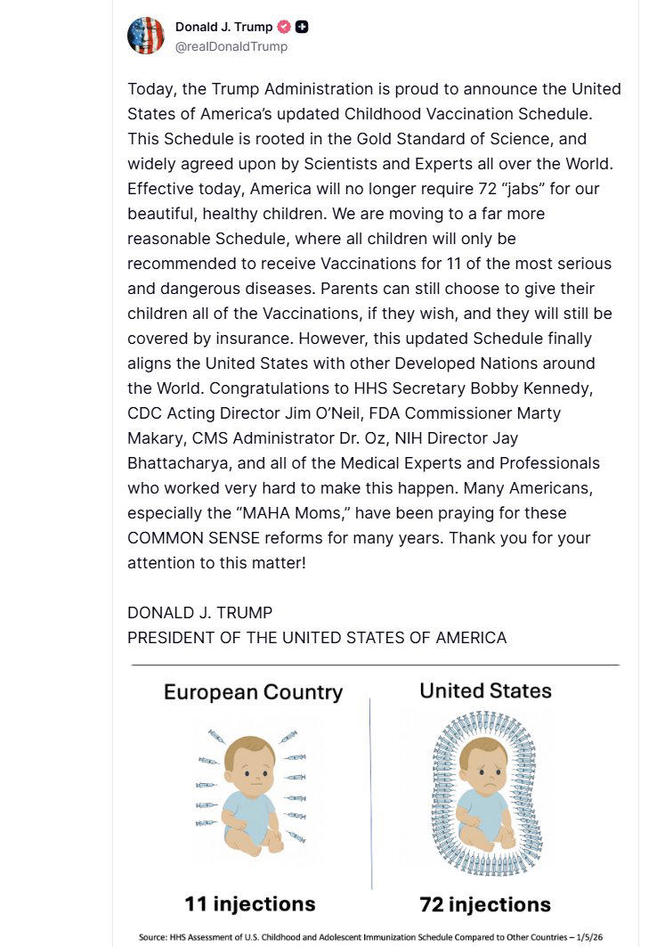 Η ομοσπονδιακή επιχειρηματολογία βασίζεται στο ότι οι ΗΠΑ εμφανίζονται να συστήνουν περισσότερα εμβόλια και περισσότερες δόσεις σε σχέση με άλλες χώρες και ότι ένα πιο «συγκρατημένο» πρόγραμμα θα μπορούσε, όπως υποστηρίζεται, να ενισχύσει την εμπιστοσύνη στη δημόσια υγεία. Στο ίδιο μήκος κύματος κινήθηκαν οι δημόσιες τοποθετήσεις του υπουργού Υγείας Ρόμπερτ Φ. Κένεντι Τζούνιορ και του ίδιου του Τραμπ.