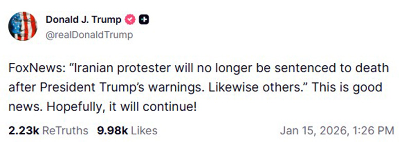 Ο Τραμπ ανακοίνωσε, επίσης, μέσω της πλατφόρμας Truth Social, ότι το Fox είχε αναφέρει πως το Ιράν δεν θα εκτελέσει εν τέλει τον Ιρανό διαδηλωτή Erfan Soltani.