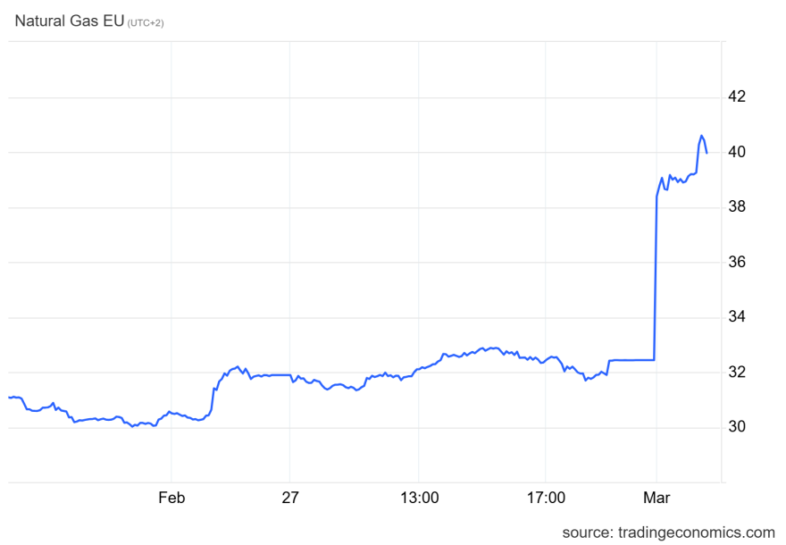 Όπως αναφέρει το Bloomberg, η Ευρώπη είναι ιδιαίτερα εκτεθειμένη. Τα αποθέματα φυσικού αερίου βρίσκονται σε ασυνήθιστα χαμηλά επίπεδα και η περιοχή χρειάζεται να εισαγάγει μεγάλους όγκους LNG αυτό το καλοκαίρι για να τα αναπληρώσει ενόψει του επόμενου χειμώνα. Εάν η ναυσιπλοΐα μέσω των Στενών του Ορμούζ διακοπεί για έναν μήνα, οι ευρωπαϊκές τιμές φυσικού αερίου θα μπορούσαν να υπερδιπλασιαστούν, σύμφωνα με την Goldman Sachs Group.