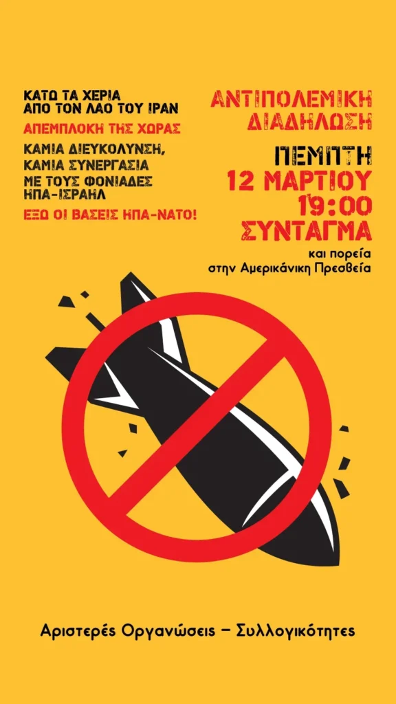 Το κάλεσμα σε αντιπολεμική συγκέντρωση διαμαρτυρίας στην πλατεία Συντάγματος, έχουν απευθύνει κόμματα, αριστερές οργανώσεις και συλλογικότητες λόγω του πολέμου στη Μέση Ανατολή.
