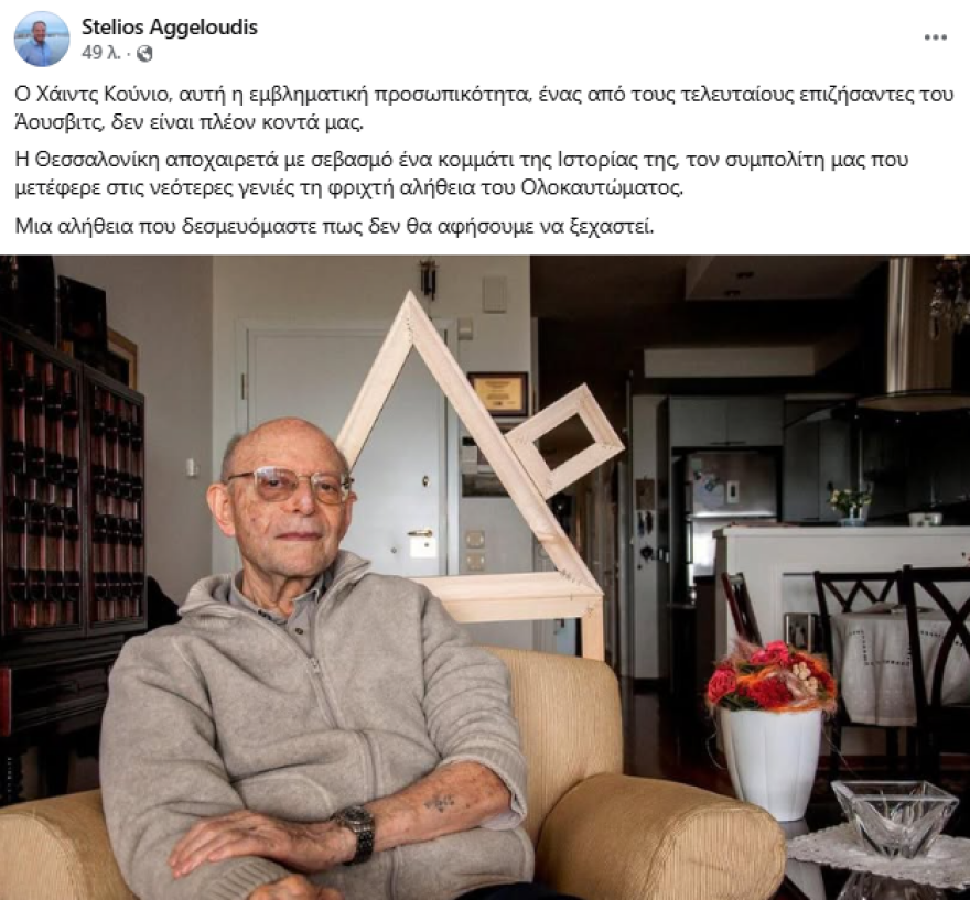 «Ο Χάιντς Κούνιο, αυτή η εμβληματική προσωπικότητα, ένας από τους τελευταίους επιζήσαντες του Άουσβιτς, δεν είναι πλέον κοντά μας. Η Θεσσαλονίκη αποχαιρετά με σεβασμό ένα κομμάτι της Ιστορίας της, τον συμπολίτη μας που μετέφερε στις νεότερες γενιές τη φριχτή αλήθεια του Ολοκαυτώματος. Μια αλήθεια που δεσμευόμαστε πως δεν θα αφήσουμε να ξεχαστεί», έγραψε στα social media ο δήμαρχος Θεσσαλονίκης, Στέλιος Αγγελούδης.