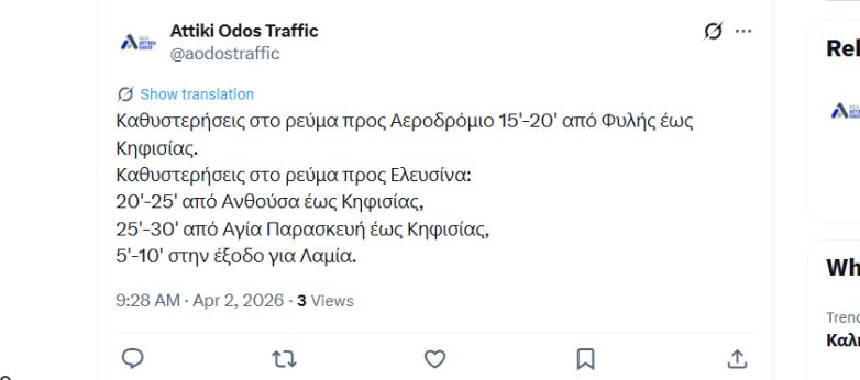 Καθυστερήσεις καταγράφονται και στην Αττική Οδό, στο ρεύμα προς Αεροδρόμιο, της τάξεως των 15 έως 20 λεπτών, από Φυλής έως Κηφισίας.