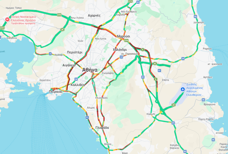 Παράλληλα, στον περιφερειακό Υμηττού, στο ίδιο ρεύμα προς Ελευσίνα, παρατηρούνται καθυστερήσεις 15 έως 20 λεπτών από την Αγία Παρασκευή έως την Κηφισίας, με αυξημένη συμφόρηση σε διάφορα σημεία.