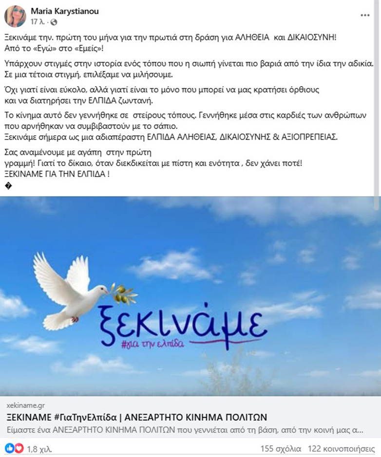 Η πρώην πρόεδρος του Συλλόγου Συγγενών Θυμάτων των Τεμπών, Μαρία Καρυστιανού, ανακοίνωσε την ίδρυση πολιτικού κινήματος. Παραπέμποντας σε ιστοσελίδα με τίτλο «Ξεκινάμε για την Ελπίδα – Ανεξάρτητο Κίνημα Πολιτών», η κ. Καρυστιανού σημείωσε, μεταξύ άλλων: «Το κίνημα αυτό δεν γεννήθηκε σε στείρους τόπους. Γεννήθηκε μέσα στις καρδιές των ανθρώπων που αρνήθηκαν να συμβιβαστούν με το σάπιο. Ξεκινάμε σήμερα ως μια αδιαπέραστη ελπίδα αλήθειας, δικαιοσύνης & αξιοπρέπειας».